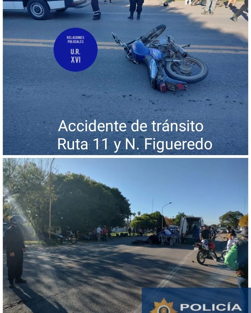 En el día de la fecha, siendo aproximadamente las 16.40 Hs., por causas que se tratan de establecer colisionaron dos motos en la intersección de Ruta Nacional N° 11 y calle Nicolás Figueredo. Una motocicleta Honda CG Titán 125 cc., la cual era conducida por un varón de 35 años de edad, con otra motocicleta Honda XR conducida por otro masculino de 27 años de edad. Ambos domiciliados en nuestra ciudad.