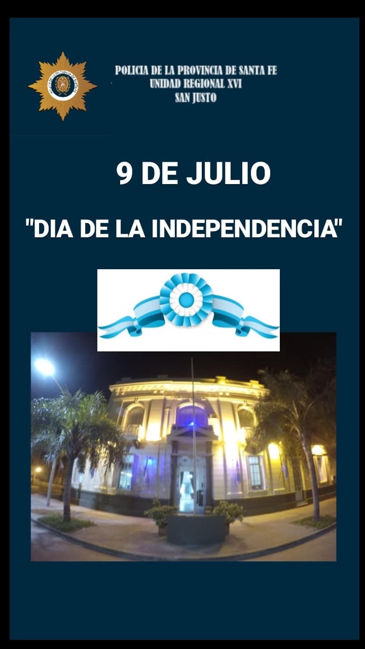 Con motivo de la celebración del “Día de la Independencia” este 9 de julio, la policía de la Unidad Regional XVI San Justo se adhiere a los festejos patrios ornamentando el frente del edificio de la Jefatura ubicada en calle 9 de Julio y Gobernador Cabal con banderas y luces alusivas en tonos azules. Viva la Patria!!!