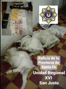 Luego de unos minutos de permanencia, se observa acercarse desde el cardinal norte un vehículo con luces encendidas con dirección hacia el sur, tratándose de una camioneta Pick Up Ford Ranger, color negro, del que previo hacer detener su marcha con señalizaciones de balizas, dos masculinos saltan de la parte trasera, la que permanecía en movimiento mientras que su conductor y acompañante descienden de la misma manera emprendiendo huida hacia el Sur. Ante esto, se les da la voz de “alto” pero hacen caso omiso, efectuándose en consecuencia un disparo intimidatorio al aire con escopeta con cartucho anti-tumulto, logrando los uniformados su reducción y aprehensión, tratándose de cuatro masculinos, uno de 40 años, domiciliado en San Bernardo, y los restantes de 28 años, 20 y 32 años, domiciliados en Videla. Seguidamente se procede a la requisa de la camioneta, observándose entre los asientos traseros cuatro animales de especie caprino (chivos) de pelaje color blanco y cabeza marrón; dos cuchillos; una mira telescópica color negro, un cartucho ORBEA calibre 16 mm color rojo; un teléfono celular marca ALCATEL y dos billeteras de cuero, una conteniendo tarjeta color VISA DEBITO y la restante la suma de $ 3.310 en billetes de distinto valor, elementos que fueron trasladados juntamente con los sujetos a la dependencia policial para la prosecución de las actuaciones.