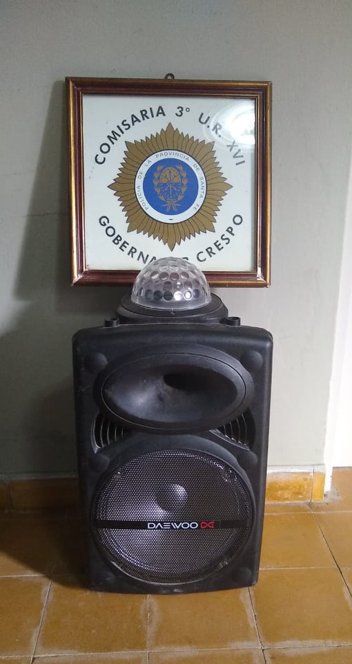 El día domingo 13 de octubre del corriente denunció un masculino de 50 años de edad, con domicilio en la ciudad de Santa Fe, quien adujo que acompañó a su hijo junto a la delegación del club Colón de Santa Fe, categoría 2011, al encuentro de Fútbol Copa Unioncito de la localidad de Gobernador Crespo, siendo hospedados en la capilla Santa Rosa de Lima sito en calle Monseñor Zaspe s/n, que al llegar siendo las 12.00 hs. del día anterior, dejó en el piso de la galería de dicho edificio, un parlante portátil de color negro, marca DAEWO, siendo la última vez que lo vio a las 00.30 hs. de la fecha antes de irse a dormir y a las 04.00 hs., al levantarse notó que sin ejercerse fuerza ni violencia autor/es ignorado/s se lo habían sustraído.