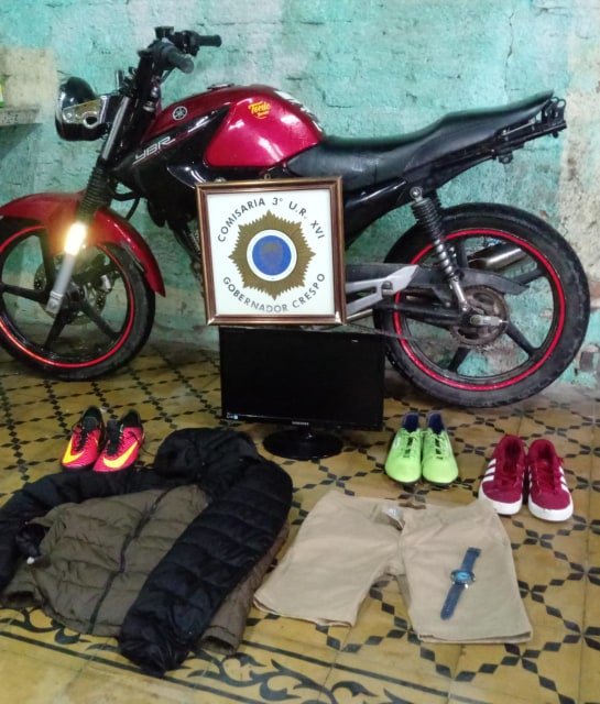 Posteriormente se hace presente en dependencia policial una mujer de 45 años edad aduciendo que entre la 01.00 hs. y 07.00 hs. de esa fecha, autor/es ignorados ingresaron sin ejercer violencia al patio trasero de su domicilio donde sustrajeron la motocicleta en cuestión, como así, ingresaron a habitación contigua propiedad de su hijo y sustrajeron vestimentas, un monitor de computadora LCD, marca Samsung, de 19”, $ 500 discriminados en billetes de $ 100, pares de zapatillas, pares de botines, un reloj con malla de cuero azul, sospechando de dos masculinos, uno mayor de edad y otro menor, los que fueron además vistos por otras personas abandonar el rodado mencionado.
