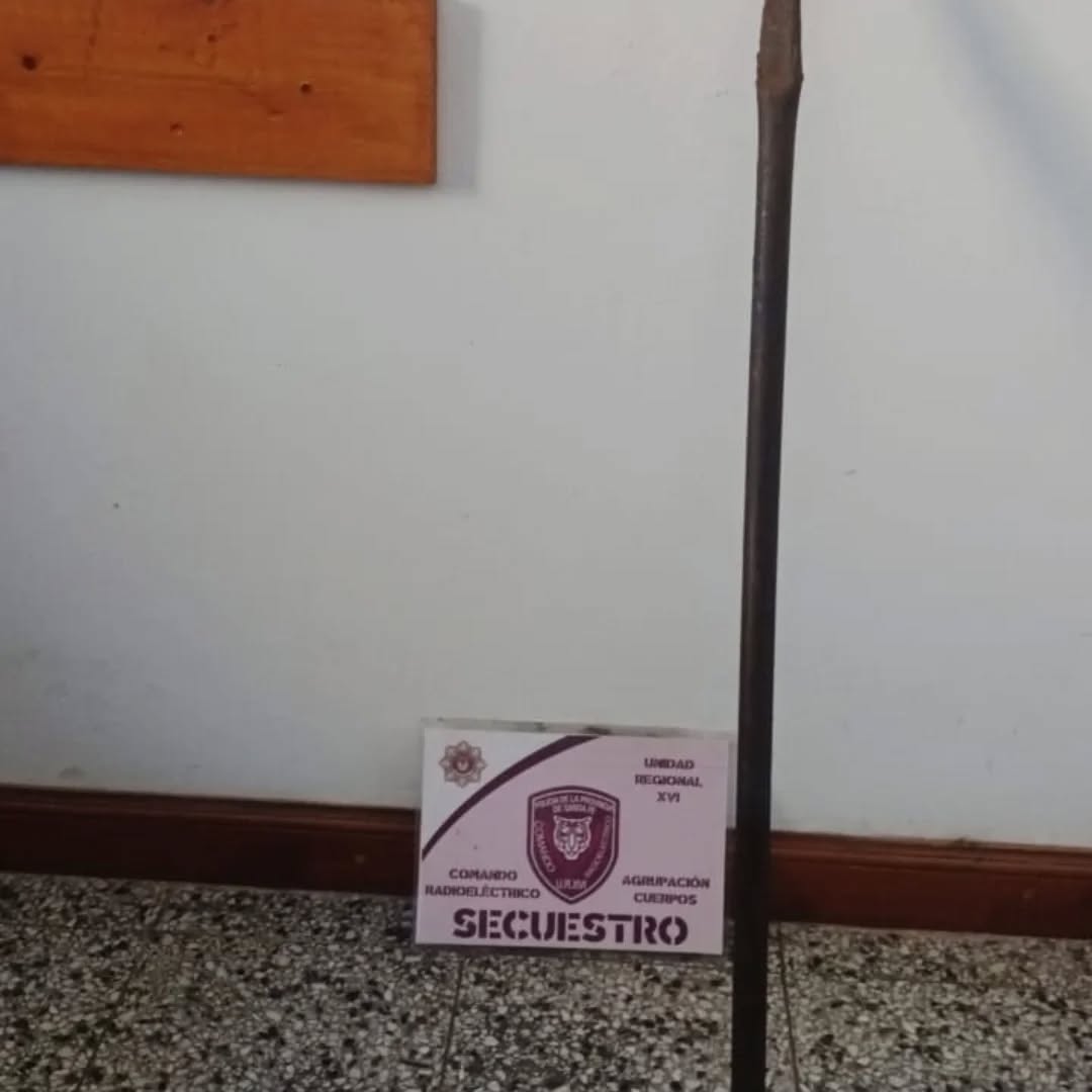 Ante la negativa, el sujeto le ocasionó un golpe a su bicicleta y sustrajo desde la canasta una garrafa de 3 kg y una bolsa con carne, retirándose del lugar. Posteriormente, personal del Comando Radioeléctrico URXVI, comisionado por Central 911, se entrevistó con la víctima, quien amplió lo sucedido. Durante recorridas, en la intersección de calles A. Belotti e Italia, los actuantes avistaron al presunto autor. Al ser identificado, el mismo amenazó al personal policial con una lanza, procediéndose a su aprehensión. Se secuestró una lanza tipo fija de caño de 1,10 m de largo.