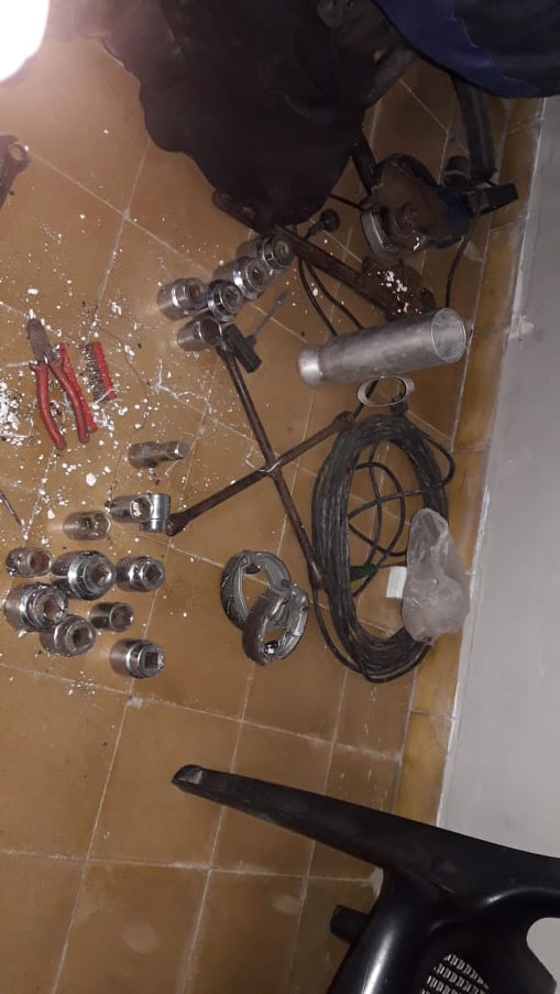 Un aire comprimido marca Castor, con culata de madera color natural, una motosierra marca Sthill, de color naranja y blanca, y luego debajo de un montículo de arena ubicado en la vereda del mismo domicilio se halló una máquina de moler carne color oxido, una morsa marca barbero N° 4 color azul, una linterna color roja, un aparejo doble con su respectiva soga, una jeringa marca líder de uso veterinario, una amoladora angular 115 mm, de 900 whats marca Black y Decker, doce tubos con mango, sin marca y numeración visible, once llaves de diferentes medidas tipo taller.