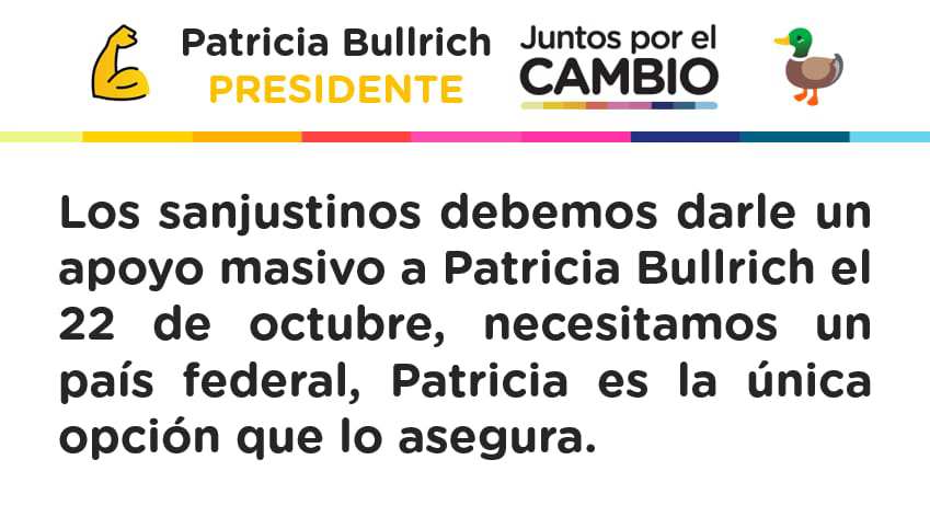 Los sanjustinos debemos darle un apoyo masivo a Patricia Bullrich el 22 de octubre, necesitamos un país federal, Patricia es la única opción que lo asegura. Haciendo un repaso del voto de los ciudadanos de San Justo en las últimas elecciones generales provinciales y las primarias nacionales, se observa un rechazo muy fuerte al kirchnerismo, en las elecciones provinciales mas de 70% de los sanjustinos no los eligió y en las nacionales el rechazo fue del 85%.