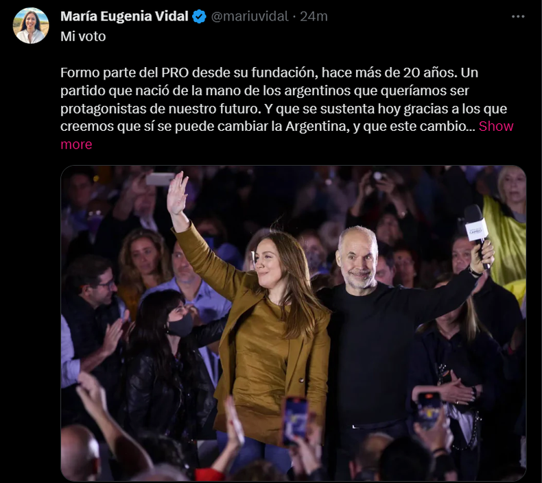 “Mi voto. Formo parte del PRO desde su fundación, hace más de 20 años. Un partido que nació de la mano de los argentinos que queríamos ser protagonistas de nuestro futuro. Y que se sustenta hoy gracias a los que creemos que sí se puede cambiar la Argentina, y que este cambio depende de nosotros.