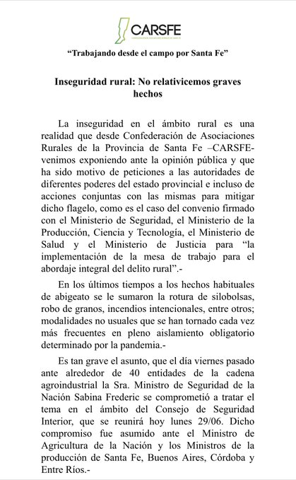 La Confederación de Asociaciones Rurales de la Provincia de Santa Fe emitió un comunicado (galería de fotos) en el que repudia los hechos de vandalismo ocurridos últimamente, en este caso el ataque a silobolsas sin dejar de lado los abigeatos.
