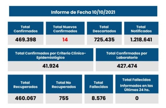 El Ministerio de Salud no informó nuevos decesos este domingo en el territorio provincial. El número de víctimas fatales acumuladas es de 8.576.