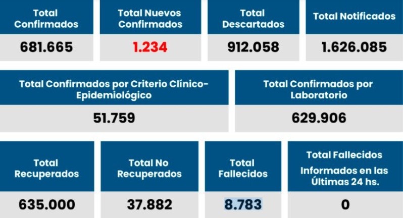 El ministerio de Salud de Santa Fe informó que se registraron 1.234 contagios nuevos este domingo. Con estos registros, los infectados desde el comienzo de la pandemia ascienden a 681.665. No hubo víctimas fatales en las últimas 24 horas.