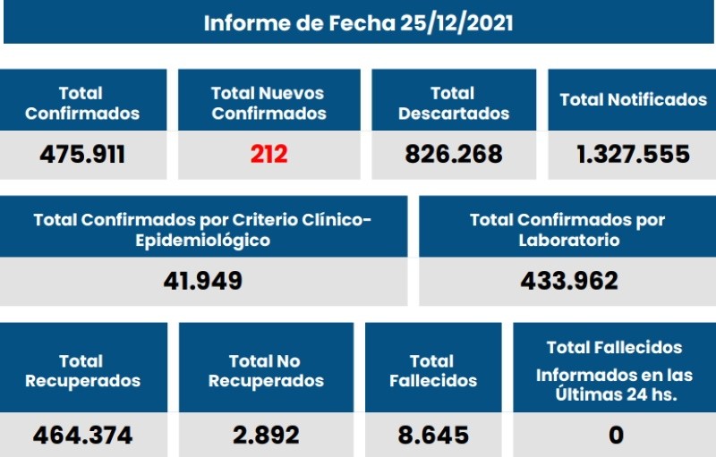 El Ministerio de Salud de Santa Fe informó 212 casos nuevos en la provincia, este sábado de Navidad. Con esos datos, el total de infectados desde el inicio de la pandemia subió a 475.911 y de ellos 2.892 permanecen como casos activos (no recuperados).