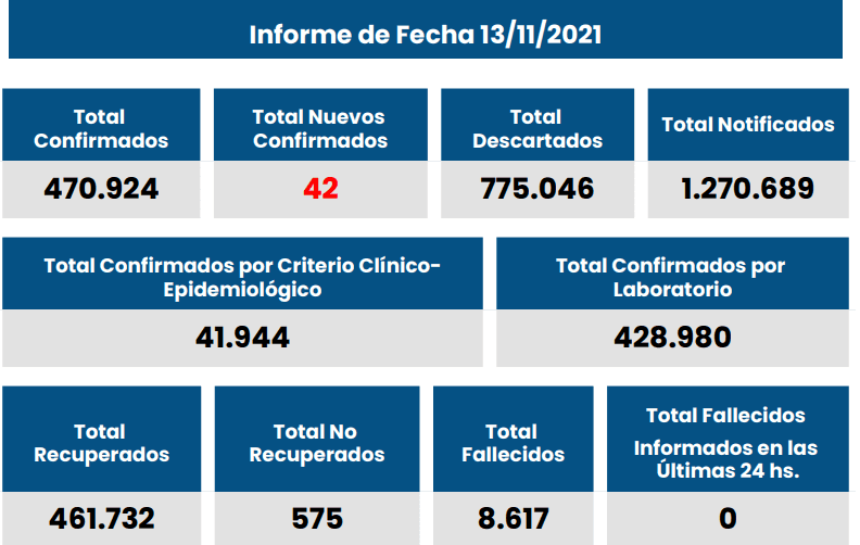 En las últimas 24 horas se informaron 42 nuevos casos, elevando a 470.924 la cantidad total desde el inicio de la pandemia.