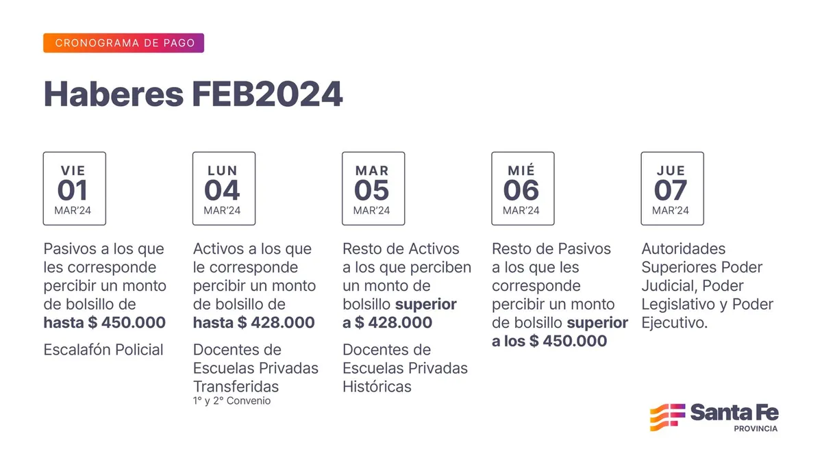 El gobierno de la provincia de Santa Fe, a través del Ministerio de Economía, informó el cronograma de pago de los haberes del mes de febrero, que se percibirán a partir del viernes 1 y hasta el miércoles 6, en el caso de los agentes públicos; y se completará el jueves 7 para las autoridades superiores de los tres poderes.