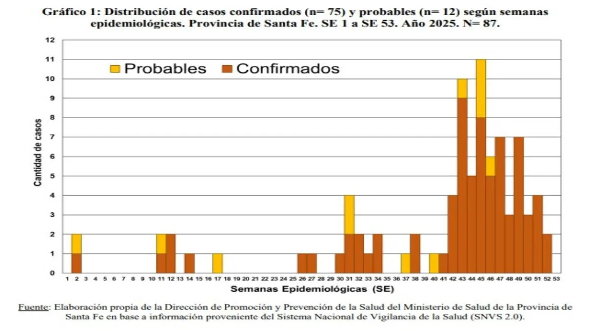 Según el informe oficial, entre las semanas 1 y 53 de 2025 se notificaron 381 casos sospechosos, de los cuales 75 fueron confirmados y 12 clasificados como probables. La mayoría de los casos se concentró en el departamento Rosario.