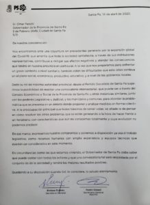 El envío de la misiva fue definido durante una reunión de su Junta Provincial realizada vía teleconferencia de la que participaron, entre otros dirigentes socialistas, los ex gobernadores Antonio Bonfatti y Miguel Lifschitz, los intendentes de Santa Fe y Villa Gobernador Gálvez, Emilio Jatón y Alberto Ricci, y los ex ministros Gonzalo Saglione (Economía), Claudia Balagué (Educación), y Andrea Uboldi (Salud), entre otros.