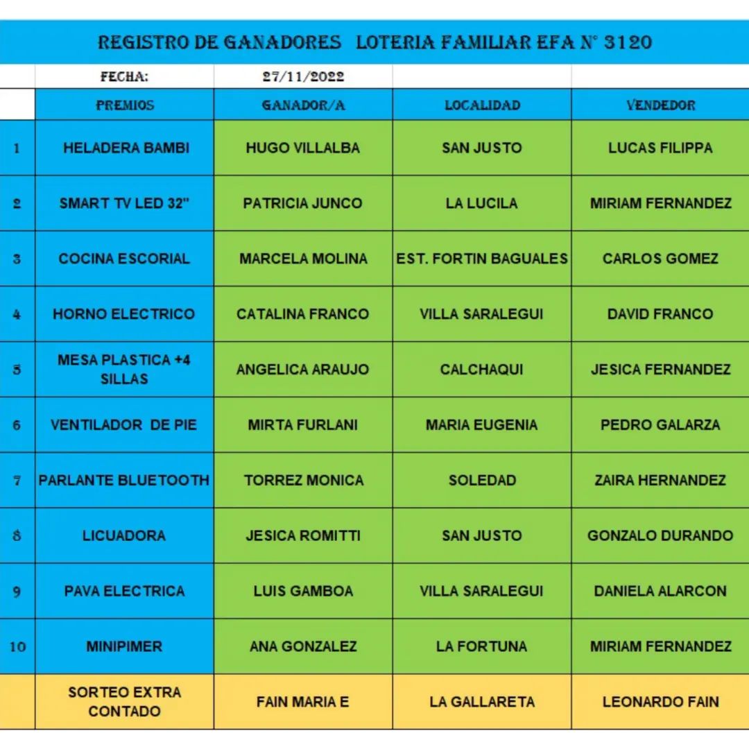 Ganadores del sorteo de la Lotería Familiar de la EFA 3120 de Villa Saralegui