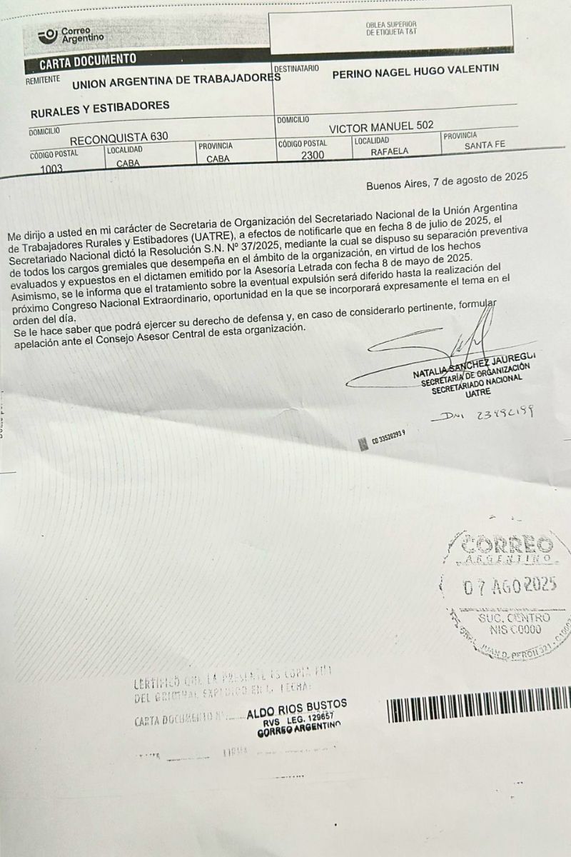 De acuerdo con el comunicado oficial, la decisión fue adoptada por el Secretariado Nacional de la organización tras verificarse que Perino empleaba a un trabajador rural sin registrar en un establecimiento de Rafaela, hecho detectado durante una inspección del Registro Nacional de Trabajadores Rurales y Empleadores (RENATRE) realizada el 22 de abril de 2025.