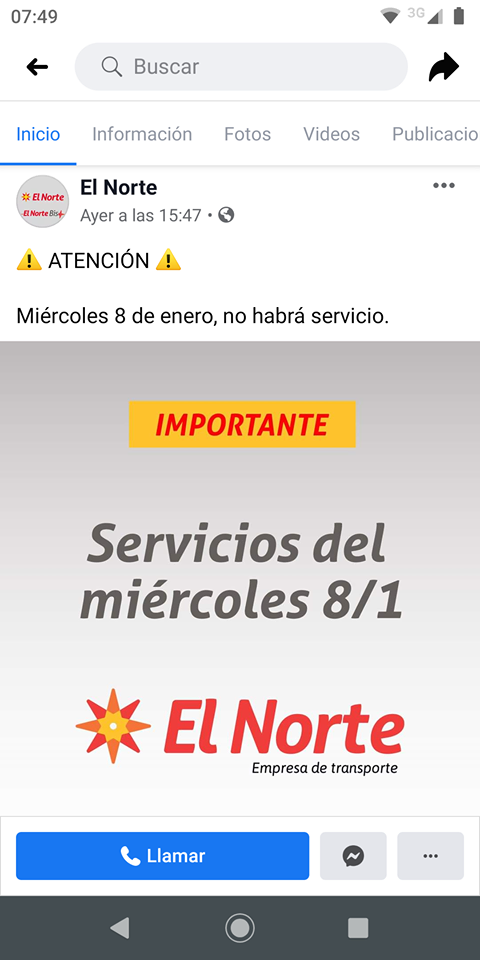 La empresa de transporte de pasajeros “El Norte SA” hoy no presta servicios en toda la provincia de Santa Fe, así lo anunció ayer en su cuenta de facebook, por el paro decretado por UTA -Unión Tranviarios Automotor- que nuclea a los empleados.