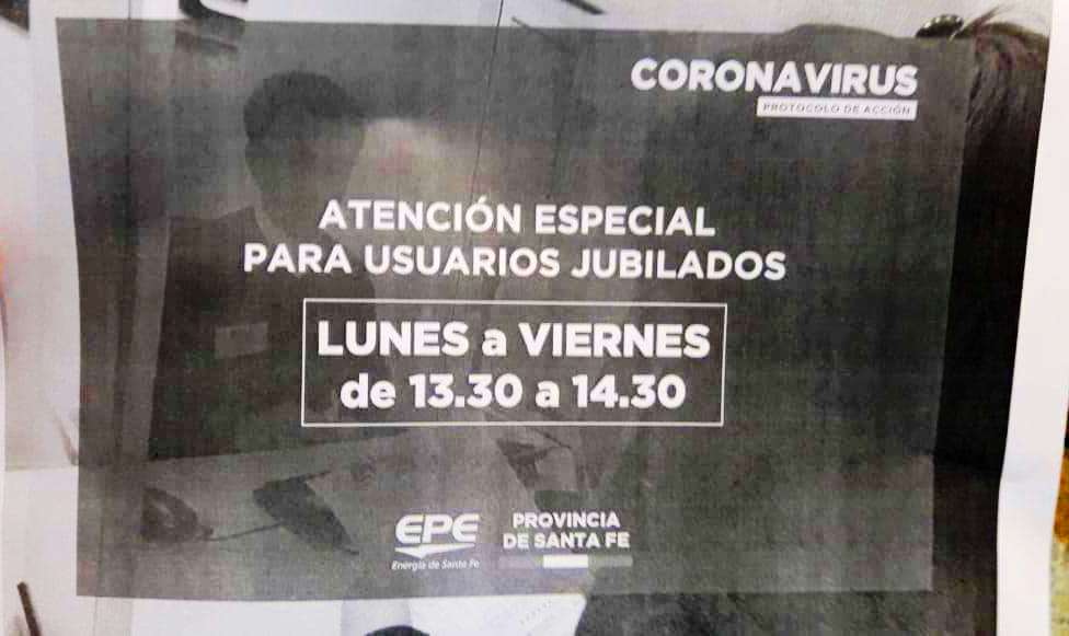 La Empresa Provincial de la Energía estableció un horario especial de atención para usuarios jubilados, siguiendo el protocolo de acción dispuesto para evitar la transmisión de coronavirus. El mismo es de lunes a viernes de 13,30 a 14,30 horas.