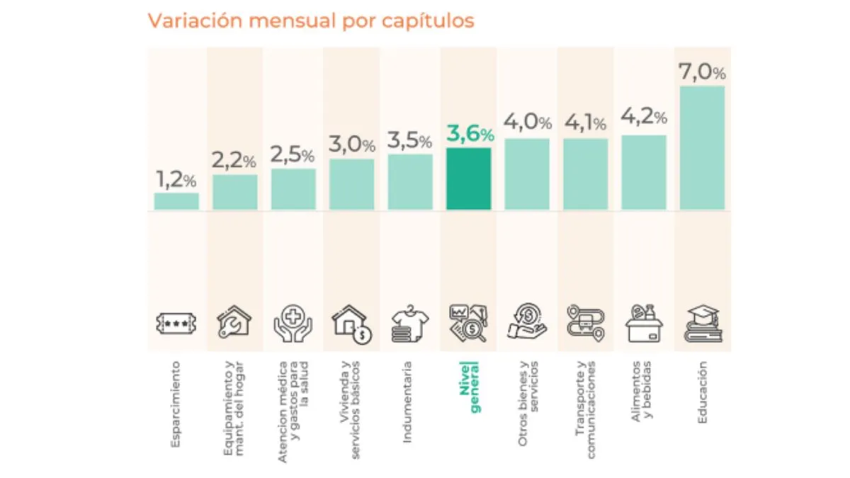 La inflación en Santa Fe estuvo impulsada por los rubros “Educación” que se disparó un +7%, seguidos por “Alimentos y bebidas no alcohólicas”, con un +4,2% y “Atención médica y gastos para la salud” con un +4,1%.