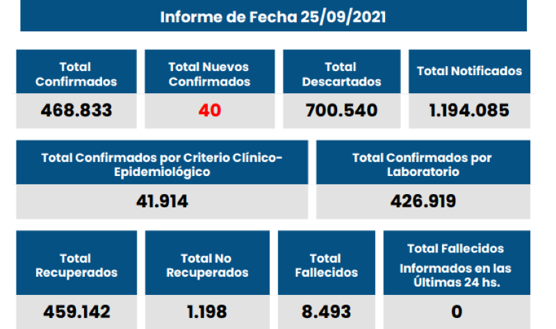 En las últimas 24 horas se informaron 40 nuevos casos, elevando a 468.833 la cantidad total desde el inicio de la pandemia y 1.198 se mantienen como activos.