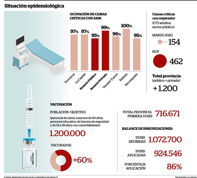 “La situación epidemiológica de la provincia es hipercrítica”, enfatizó la ministra de Salud, Sonia Martorano, y para dimensionar la gravedad de su afirmación recurrió a las estadísticas oficiales: todos los departamentos santafesinos se encuentran en alto riesgo y tres de ellos directamente en alarma. Se trata de La Capital, San Lorenzo y Rosario, éste con una tasa de incidencia de casos acumulados en las últimas dos semanas de 1.033 cada 100 mil habitantes, cifra siete veces mayor que el indicador ya a partir de 150 se considera alto. A esto hay que sumarle la ocupación de camas críticas, del 99 por ciento en el sector privado y 95 en el público en la ciudad, mientras que en la provincia el porcentaje trepa al 97.