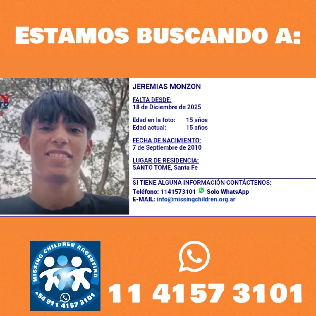 Missing Children Argentina difundió el pedido de paradero de Jeremías Monzón, el adolescente de 15 años desaparecido en nuestra ciudad desde el pasado jueves 18 de diciembre. La organización publicó la imagen del joven tanto en sus redes sociales como en su sitio web oficial, con el objetivo de ampliar el alcance de la búsqueda a nivel nacional.