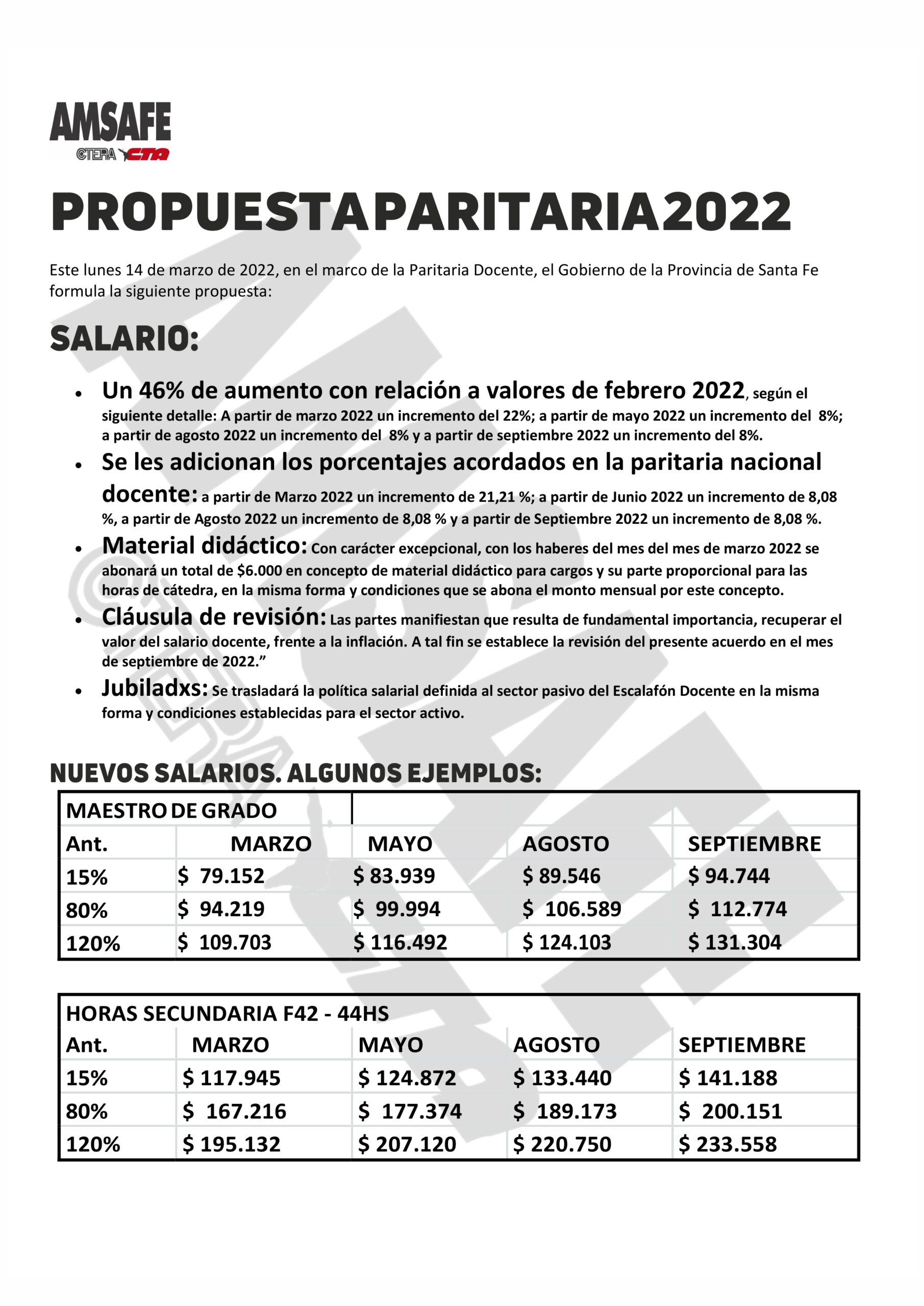 Fruto de la lucha en unidad de la docencia nucleada en AMSAFE, la Comisión Directiva Provincial comunica que en el encuentro paritario de la mañana de este lunes 14 de marzo de 2022, el Gobierno de la Provincia realizó una nueva propuesta Paritaria.