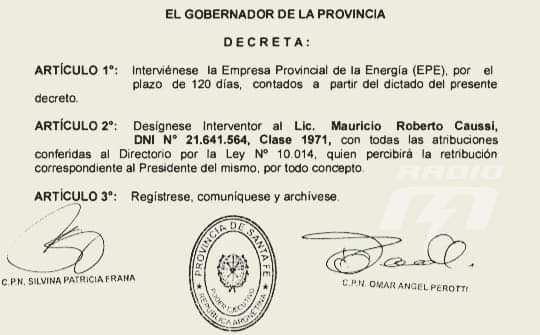 La medida fue adoptada a través de un decreto del flamante mandatario, que consta de tres artículos. En el segundo de ellos se designa interventor a Mauricio Roberto Caussi, quien ya había sido anunciado para ocupar la titularidad de la EPE durante la presentación del nuevo Gabinete. Caussi, dice el texto, “tendrá todas las atribuciones conferidas al directorio”.
