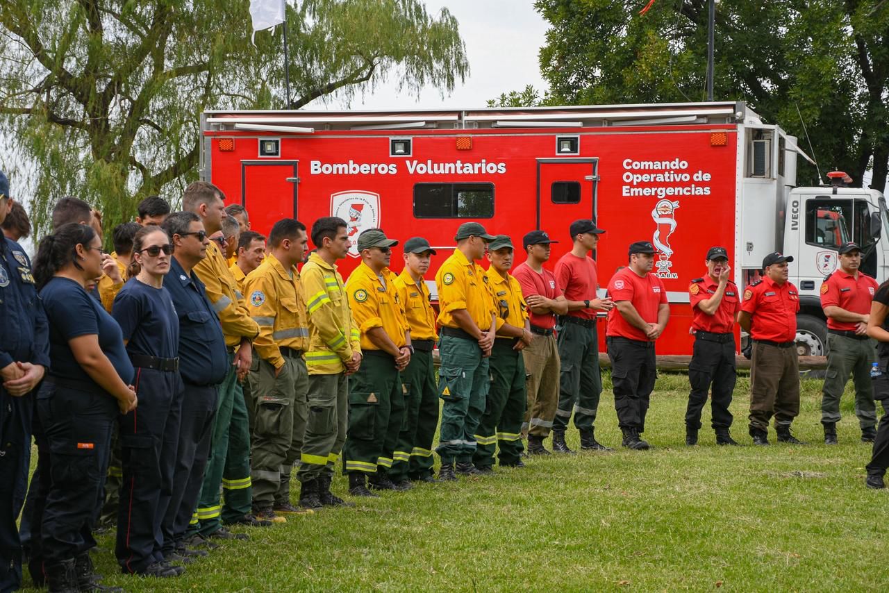 El encuentro se realizó en Alvear y contó con la participación del ministro de Ambiente y Cambio Climático de Santa Fe, Enrique Estévez; el ministro de Seguridad de la Provincia de Buenos Aires, Javier Alonso; el ministro de Desarrollo Económico de Entre Ríos, Guillermo Bernaudo; el secretario de Protección Civil y Gestión del Riesgo de Santa Fe, Marcos Escajadillo; brigadistas, equipos técnicos, protecciones civiles de las tres provincias, representantes de gobiernos locales santafesinos y funcionarios de la AFE.