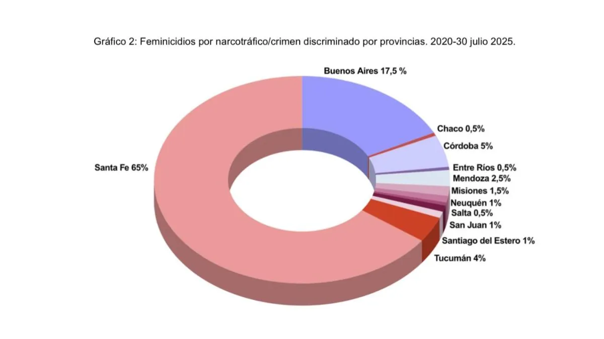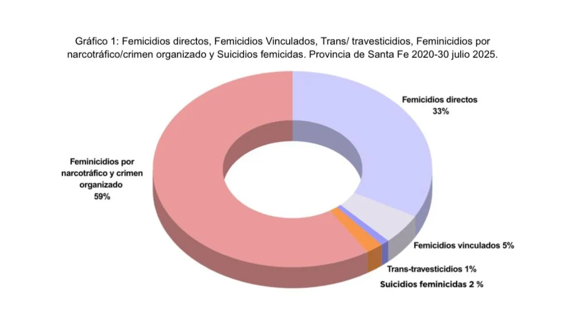 Otra cifra que alarma en la provincia de Santa Fe es que, en los últimos cinco años, los femicidios vinculados a la narcocriminalidad superaron a los femicidios directos, cometidos en contextos de relaciones íntimas o de pareja. Los femicidios por narcotráfico y crimen organizado ocuparon el 59%, mientras que los femicidios directos representaron el 33%.